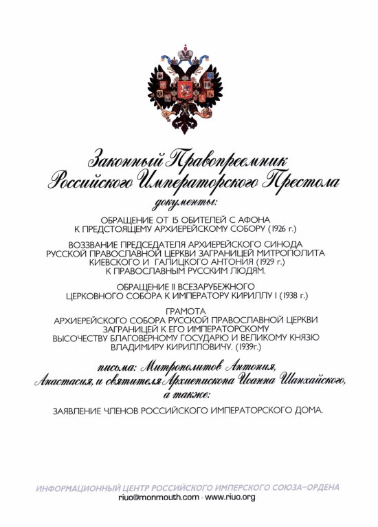 прямого и законного наследника Русского Престола Великого Князя Кирилла Владимировича,