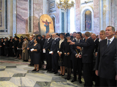 По правую руку Е.И.В. Государыни Великой Княгини Марии Владимировны Ее Величество Королева Анна-Мария Греческая, младшая сестра Королевы Дании Маргариты П. По левую руку Государыни (в порядке удаления): Его Величество Король Греции Константин II, Их Королевские Высочества Принц Михаил Кентский, Принцесса Мария-Кристина Кентская, Кронпринцесса Датская Мария-Елисавета и Кронпринц Датский Фредерик. После открытия выставки в Эрмитажном театре в присутствии Кронпринца и Кронпринцессы Датских состоялся концерт Оркестра Королевской Гвардии Дании. В этот же день Их Королевские Высочества посетили Аничков дворец, столичную резиденцию Императора Александра III и Его Семьи, где осмотрели проходящую там выставку фотографий, посвященную Императрице Марии Федоровне, из архива Королевской библиотеки Копенгагена. 28 сентября в 8 часов утра из Москвы в Санкт-Петербург для участия в церемонии перезахоронения Императрицы Марии Федоровны прибыла Глава Российского Императорского Дома Великая Княгиня Мария Владимировна. На московском вокзале Ее Императорское Высочество встречали Начальник Российского Имперского Союза-Ордена ГА. Федоров с супругой Ириной Олеговной, и.о. предводителя Российского дворянского собрания СЛ Сапожников и вице-предводитель А.Ю. Королев-Перелешин, начальник С-Пб. отдела РИС-О Б.С Туровский, и другие. ПЕТЕРГОФ. В 9 часов утра саркофаг Императрицы был вынесен из Готической капеллы в парке Александрия и траурный кортеж отправился в Царское Село, где на плацу Екатерининского дворца была отслужена литургия, после которой траурная процессия отправилась в Санкт-Петербург. Весь маршрут движения до Исаакиевского собора был оформлен бело-сине-красными флагами РФ и Санкт-Петербурга с траурными лентами. САНКТ-ПЕТЕРБУРГ. В 11 часов в Исаакиевский собор стали прибывать приглашенные почетные гости. Практически все подходы к главному храму Санкт-Петербурга были заполнены толпами народа. Вскоре стали прибывать представители Королевских Семей, которые заходили в собор через северный вход и вставали в специально отведенном месте в центре собора. Первыми появились Их Королевские Высочества Принц Михаил Кентский, официально представлявший на перезахоронении Королеву Великобритании Елизавету II, и его супруга Принцесса Мария-Кристина. Затем в собор прибыли Их Величества Король Греции Константин II и Королева Анна-Мария. Последними по красной ковровой дорожке поднялись Великая Княгиня Мария Владимировна вместе с Кронпринцем Датским Фредериком и Кронпринцессой Мэрией-Елисаветой. Ее Императорское Высочество приветствовала всех представителей Августейших Семей Европы и встала на специально отведенном месте. По левую руку Государыни Марии Владимировны стоял Король Константин II, крестный отец Наследника Цесаревича и Великого Князя Георгия Михайловича, по правую была Королева Анна-Мария. Ровно в полдень траурный кортеж подъехал к Исаакиевскому собору, гроб Императрицы был внесен в храм и установлен на специальном постаменте. После этого Патриарх дал знак к началу богослужения, которое он совершил в сослужении митрополита Санкт-Петербургского и Ладожского Владимира, митрополита Смоленского и Калининградского Кирилла, митрополита Калужского и Боровского Климента, и епископа Петергофского Маркелла. Вместе с ними молилис